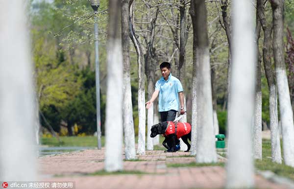 En el Centro de Adiestramiento de Perros de Dalian, provincia de Liaoning, un hombre entrena a un perro guía para que evite los obstáculos del camino. Los perros guías, a menudo de raza Labrador o perdigueros de oro, se envían a las familias de acogida cuando son cachorros y se les entrena, durante un a?o, habilidades para asistir a los due?os que carecen de visión. Los que destacan por su inteligencia, recibir otro a?o de perfeccionamiento. [Foto: IC]