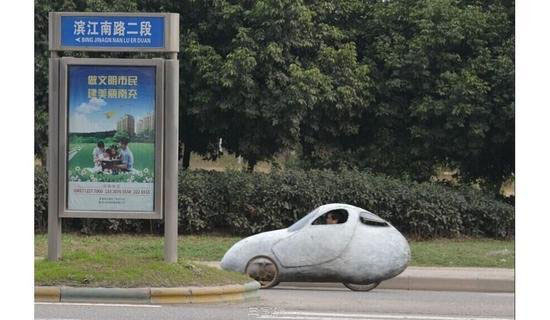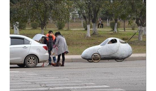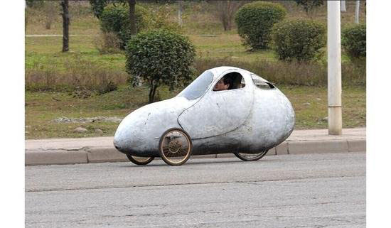 Chengdu,26/02/2016(El Pueblo en Línea)-Fotos del 23 de febrero de 2016 muestran un vehículo con forma de bala en la ciudad de Nanchong, provincia de Sichuan. El vehículo se fabricó a partir de una bicicleta de tres ruedas y una carrocería de plástico. Un hombre de treinta a?os y un ni?o estaban en el interior del vehículo cuando los paró la policía.