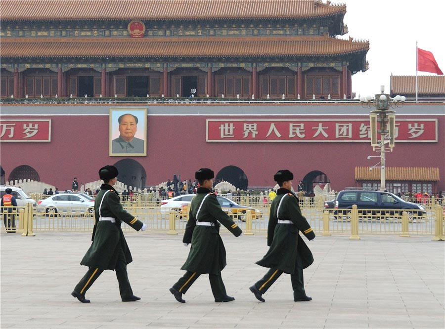 Policías patrullan en la Plaza de Tiananmen, el 29 de febrero de 2016.