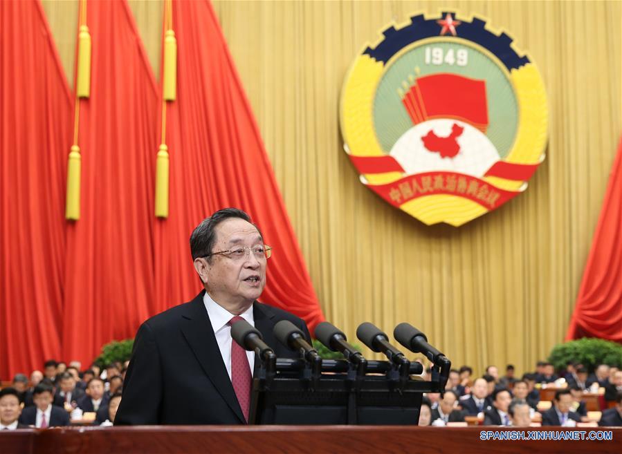 Yu Zhengsheng, presidente del Comité Nacional de la Conferencia Consultiva Política del Pueblo Chino (CCPPCh), entrega un informe sobre la labor del Comité Permanente del Comité Nacional de la CCPPCh enla cuarta sesión anual del XII Comité Nacional de la CCPPChen el Gran Palacio del Pueblo en Beijing, capital de China 3 de marzo de 2016.(Xinhua/Pang Xinglei)