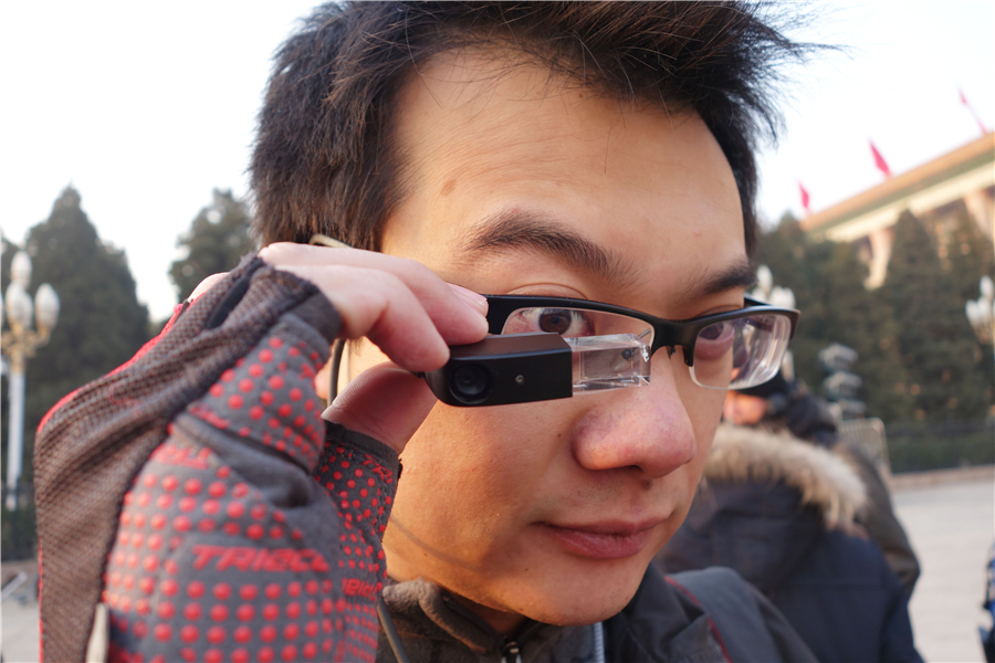 Un reportero porta gafas inteligentes durante las “Dos Sesiones” del 2016. Beijing, 5 de marzo de 2015. [Foto: PPC]