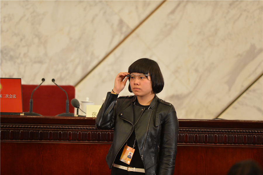 Una periodista del destacado Diario del Pueblo utiliza unos espejuelos inteligentes Google durante la conferencia de prensa de la II sesión de la CCPPCh en el Gran Palacio del Pueblo, Beijing, 2 de marzo de 2014. [Foto: PPC]