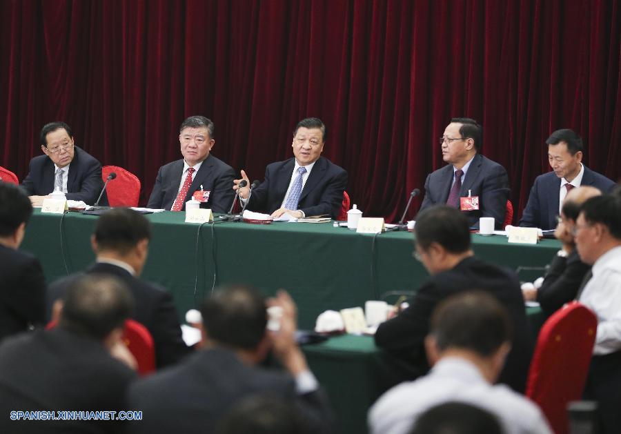 Liu Yunshan, miembro del Comité Permanente del Buró Político del Comité Central del Partido Comunista de China (PCCh), participa en un panel con un grupo del Partido Democrático Campesino y Obrero de China y de la Liga Democrática de China en Beijing, capital de China, el 4 de marzo de 2016. (Xinhua/Ding Lin)