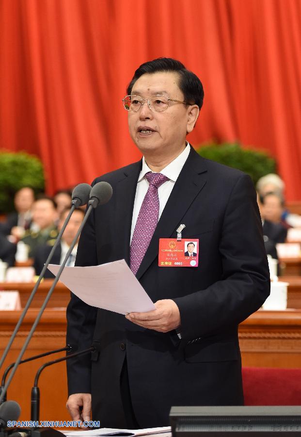 Zhang Dejiang, presidente del Comité Permanente de la Asamblea Popular Nacional (APN), preside la reunión inaugural de la cuarta sesión de la XII de la Asamblea Popular Nacional. (Xinhua/Li Xueren)