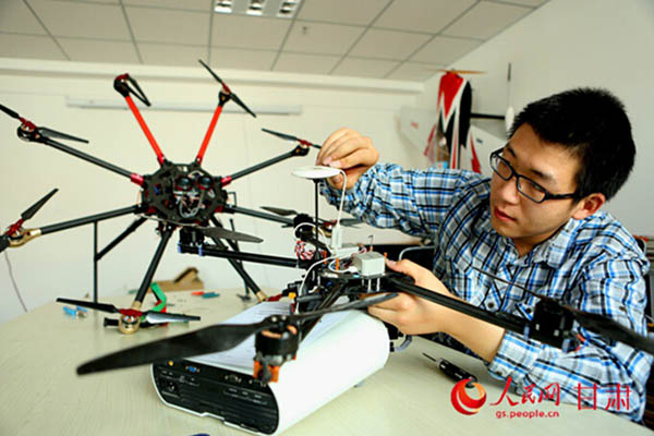 Yang Qifan, de 26 a?os, prueba un circuito de un dron. él y su equipo están trabajando en un "sistema de riego por aspersión con vehículos aéreos no tripulados". El dispositivo puede ajustar automáticamente la cantidad de líquido dispensado durante la fumigación. (Foto: Mou Jian, Pueblo en Línea )