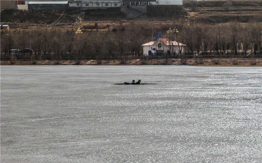 Dos ni?os cayeron accidentalmente en un agujero en un río parcialmente congelado de la ciudad de Guyuan, en la región autónoma de Ningxia Hui. Siete bomberos se enfrentaron al peligro de perecer congelados en aguas heladas y arriesgaron sus vidas para rescatarlos. [Foto: PPC]