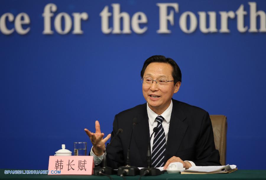 El ministro de Agricultura, Han Changfu, participa en una conferencia de prensa en el marco de la sesión anual de la Asamblea Popular Nacional, en Beijing, China, el 7 de marzo de 2016. (Xinhua/Jin Liwang)