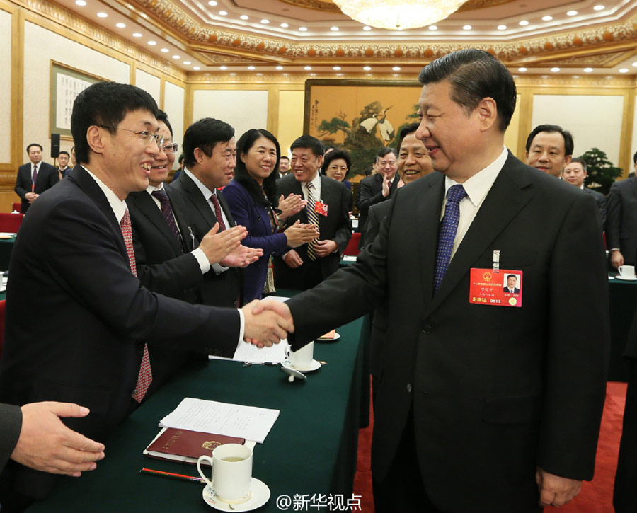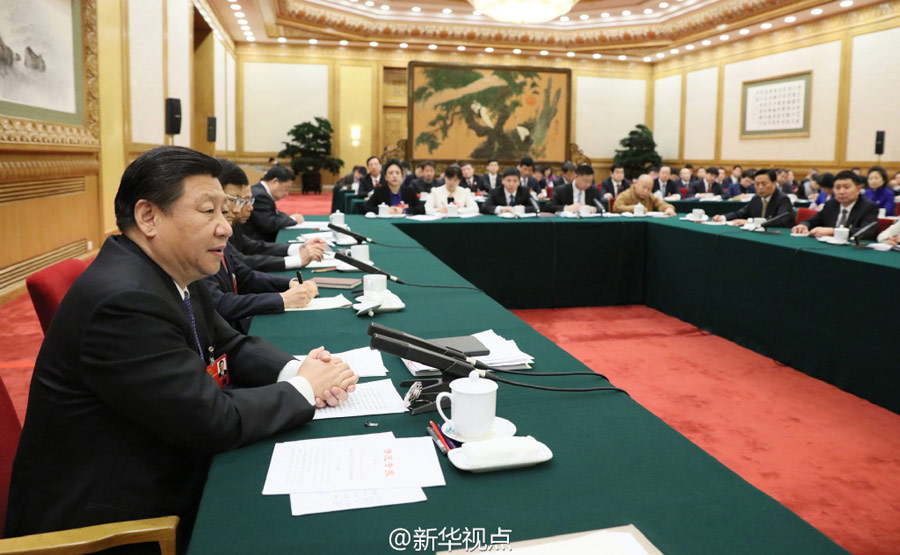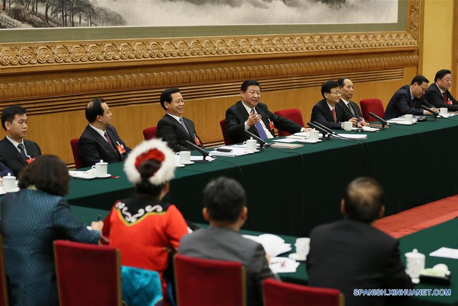 El presidente chino, Xi Jinping, se une a los legisladores provenientes de la provincia nororiental china de Heilongjiang para deliberar el informe sobre la labor del gobierno durante la sesión parlamentaria anual, en Beijing, China, el 7 de marzo de 2016. (Xinhua)