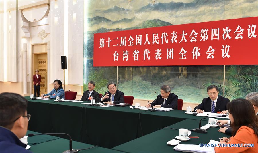 Yu Zhengsheng, el presidente del Comité Nacional de la Conferencia Consultiva Política del Pueblo Chino, habla en una deliberación grupo de diputados de Taiwan de China de la sesión anual del Congreso Nacional del Pueblo en Beijing, capital de China, 7 de marzo de 2016. (Xinhua / Gao Jie)