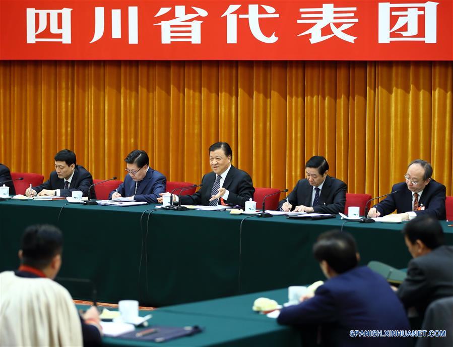 Liu Yunshan, miembro del Comité Permanente del Buró Político del Comité Central del Partido Comunista de China (PCCh), habla en una deliberación grupo de diputados de la provincia de Sichuan de la sesión anual del Congreso Nacional del Pueblo en Beijing, capital de China, 7 de marzo de 2016. (Xinhua / Ding Haitao)