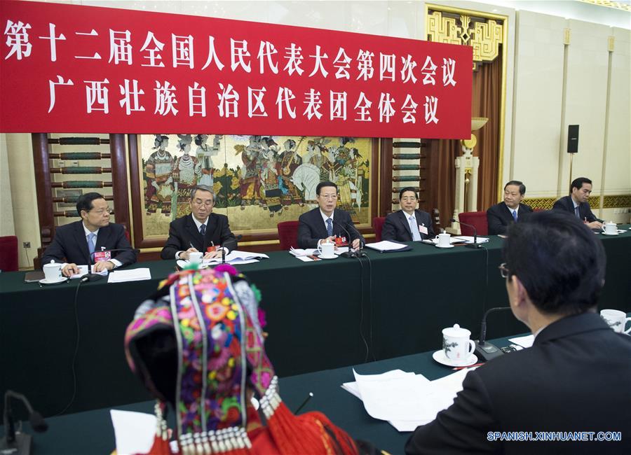 El viceprimer ministro chino Zhang Gaoli habala en una deliberación grupo de diputados de la Región Autónoma Zhuang de Guangxi de la sesión anual del Congreso Nacional del Pueblo en Beijing, capital de China, 7 de marzo de 2016. (Xinhua / Wang Ye)