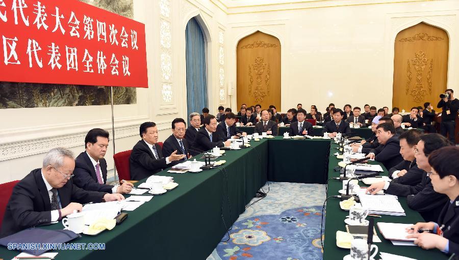 Liu Yunshan, un miembro del Comité Permanente del Buró Político del Comité Central del Partido Comunista de China (PCCh), se reúne con diputados de la APN de la región autónoma hui de Ningxia en el noroeste de China, en Beijing, capital de China, el 8 de marzo de 2016. (Xinhua/Zhang Duo)