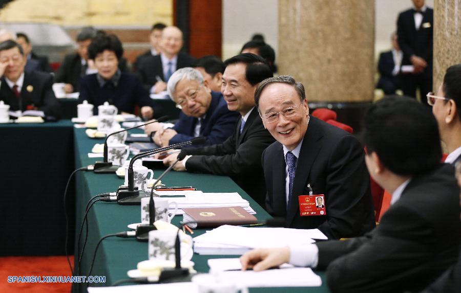 El jefe de control disciplinario del PCCh, Wang Qishan, se reúne con legisladores de la provincia nororiental de Liaoning, en Beijing, capital de China, el 8 de marzo de 2016. (Xinhua/Ju Peng)