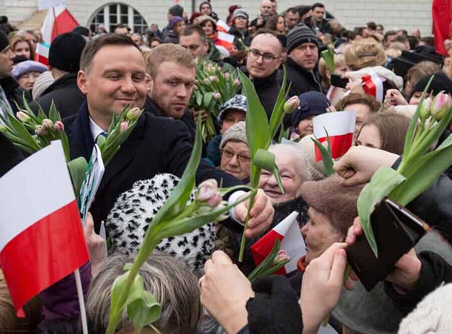 Andrzej Duda, presidente de Polonia, entrega flores durante el Día de la Mujer.