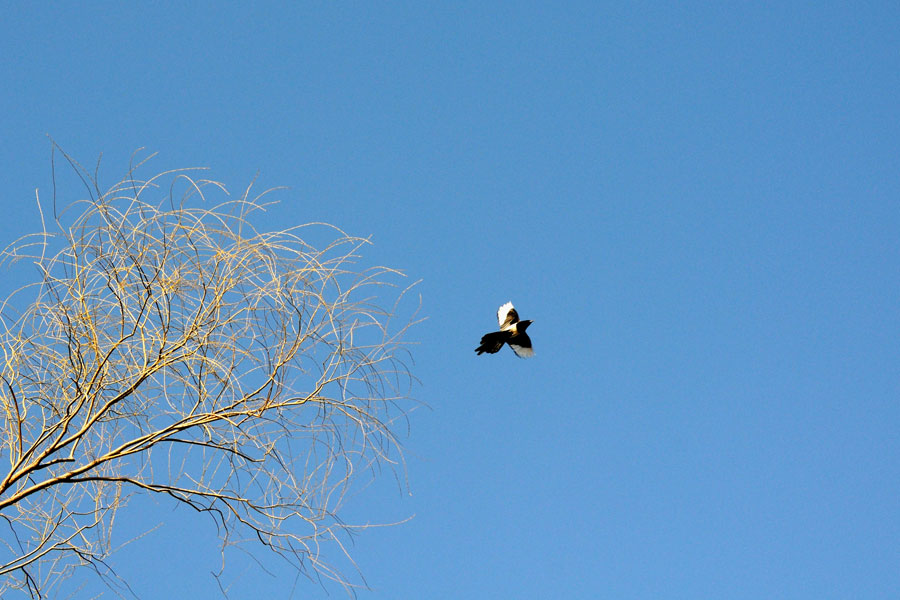 Un pájaro vuela en el limpio cielo de Beijing. 10 de marzo de 2016. [Foto: PPC]