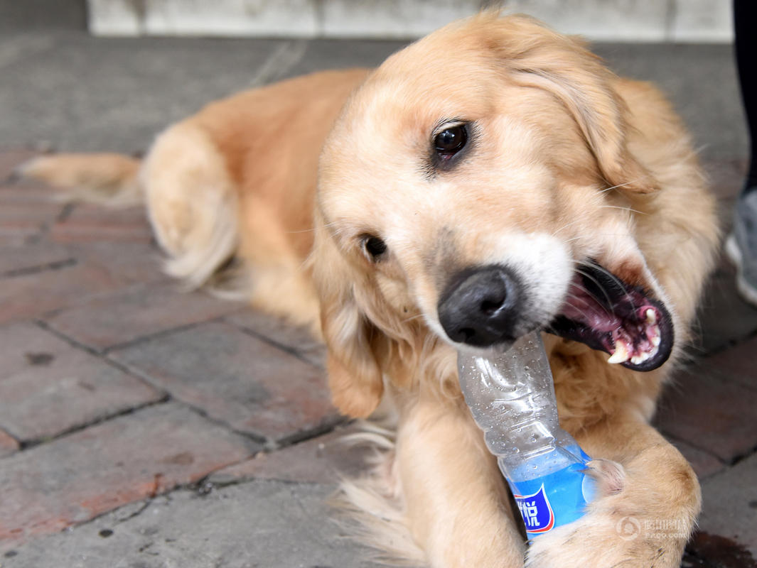 Golden retriever limpia la calle con su due?a barrendera en Chengdu, recogiendo botellas para recibir recompensas