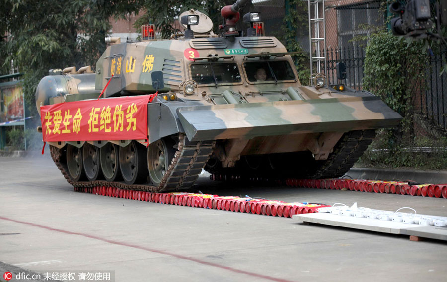 Un tanque destruye productos falsos y de mala calidad en Foshan, provincia de Guangdong.