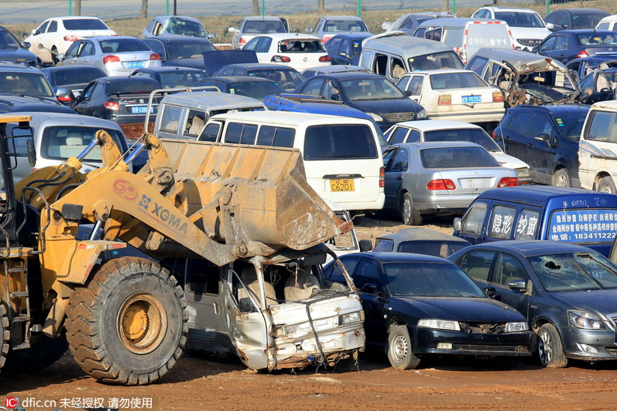 Una excavadora destruye vehículos contaminantes y ensamblados ilegalmente en Dalian, provincia de Liaoning.