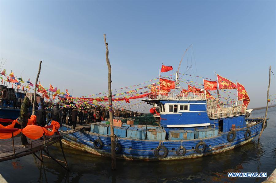 El pueblo asiste a una bendición ritual para la abundante pesca y la buena suerte de los pescadores que salen hacia alta mar en Jiegou, Panjin, provincia de Liaoning, 15 de marzo de 2016. En Jiegou, el río de la zona desemboca en el mar. Durante la ceremonia los pescadores rezan y piden protección antes de comenzar a navegar. (Foto: Li Gang)