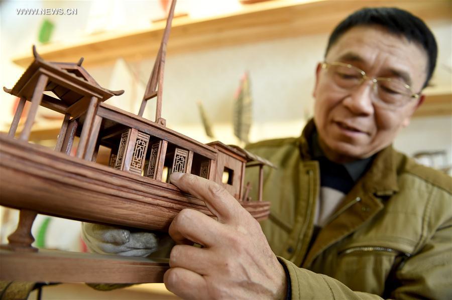 Wu Pei, artesano y artista de Hefei, capital de la provincia de Anhui, muestra los modelos de barcos realizados en su taller. Wu se especializa en estructuras de madera delicadas. Sus obras han sido expuestas en galerías y nacionales y extranjeras. (Foto: Guo Chen)