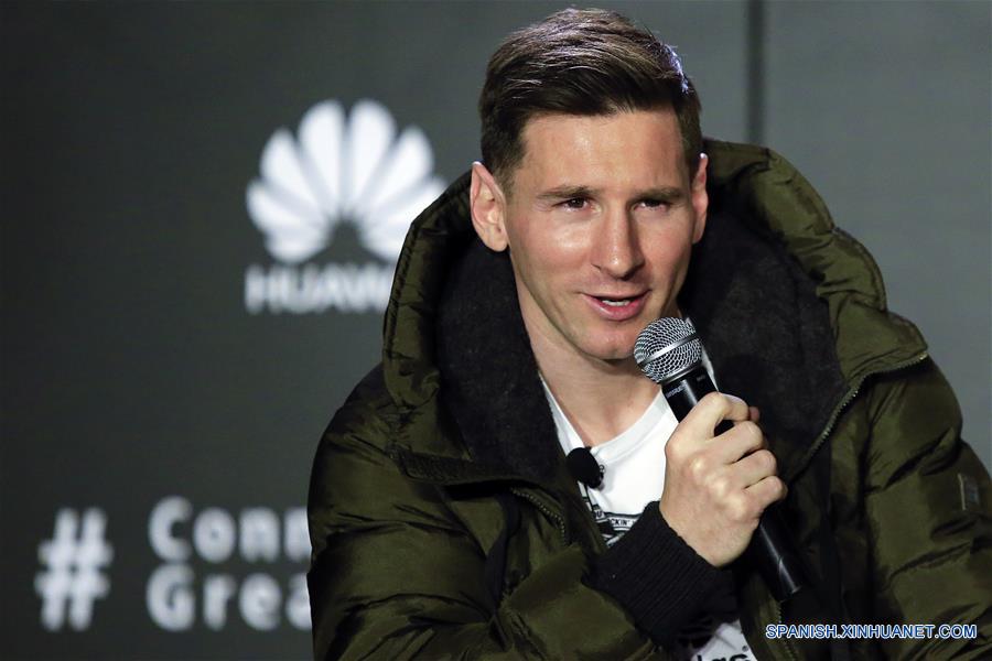 Delantero argentino del FC Barcelona Lionel Messi asiste a una conferencia de prensa en la que Huawei anuncia el nombramiento de Messi como embajador de la marca más reciente de la compa?ía Global en Barcelona, Espa?a, 17 de marzo de 2016. (Xinhua / Pau Barrena)