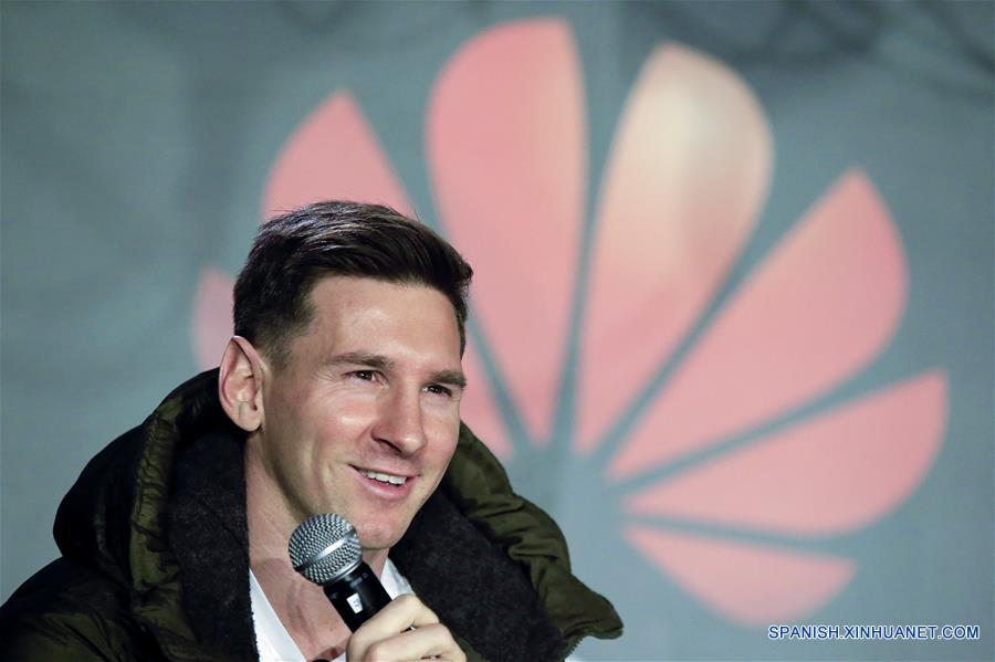 Delantero argentino del FC Barcelona Lionel Messi asiste a una conferencia de prensa en la que Huawei anuncia el nombramiento de Messi como embajador de la marca más reciente de la compa?ía Global en Barcelona, Espa?a, 17 de marzo de 2016. (Xinhua / Pau Barrena)