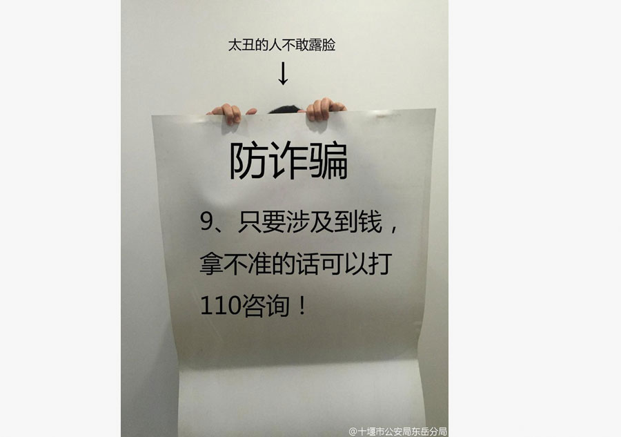 “Cuando usted no está segurode como proceder con temas de pagos de dinero, llame al 110 para recibir consejos especializados de la policia china. [Foto: Weibo]