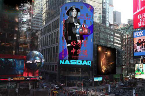 La cantante callejera convertida en empresaria hace publicidad en una pantalla de Times Square