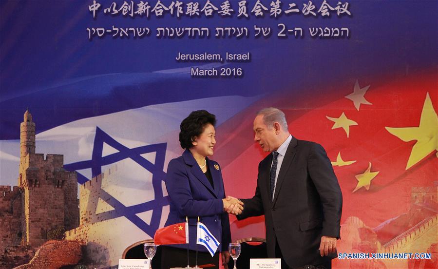 La viceprimera ministra china Liu Yandong se da la mano con el primer ministro israelí, Benjamin Netanyahu, en la segunda reunión del Comité Conjunto Chino-Israel sobre Cooperación Innovación en Jerusalén, 29 de marzo de 2016. (Xinhua / Gil Cohen Magen)