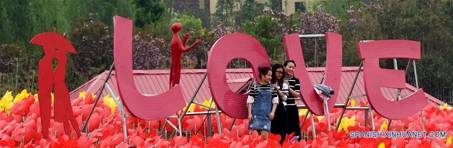 Turistas observan rehiletes de colores durante el Festival Internacional de Rehiletes, en Luoyang, en la provincia de Henan, en el centro de China, el 4 de abril de 2016. Un total de 500,000 rehiletes coloridos fueron colocados en distintas formas en el festival. (Xinhua/Li Bo)