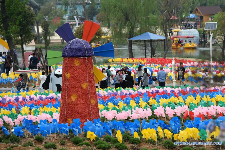 Turistas observan rehiletes de colores durante el Festival Internacional de Rehiletes, en Luoyang, en la provincia de Henan, en el centro de China, el 4 de abril de 2016. Un total de 500,000 rehiletes coloridos fueron colocados en distintas formas en el festival. (Xinhua/Li Bo)