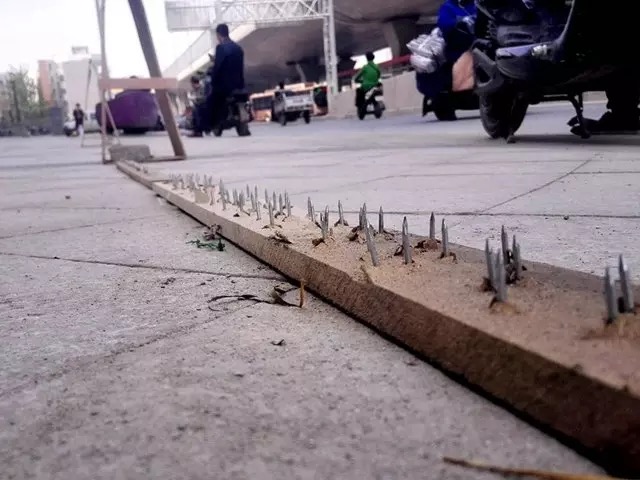 Henan,06/04/2016(El Pueblo en Línea)-Filas de clavos de aceros, enfilados sobre soportes de madera, se han colocado en las inmediaciones de un centro comercial de Zhengzhou, en la provincia de Henan, con el objetivo de matener alejados a los indisciplinados chóferes que buscan aparcamiento a toda costa.