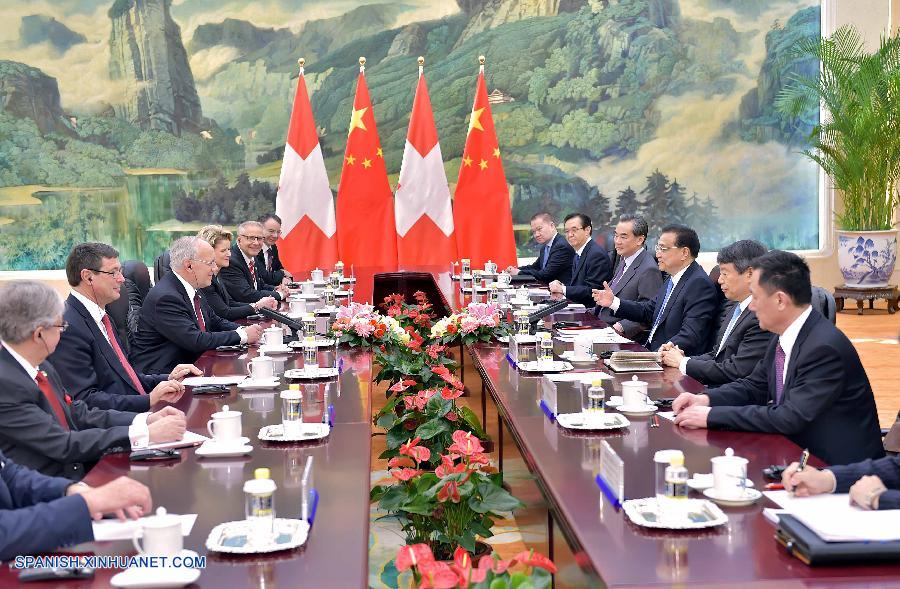 El primer ministro de China, Li Keqiang, se reúne con el presidente de Suiza, Johann Schneider-Ammann, en Beijing, capital de China, el 7 de abril de 2016. (Xinhua/Li Tao)