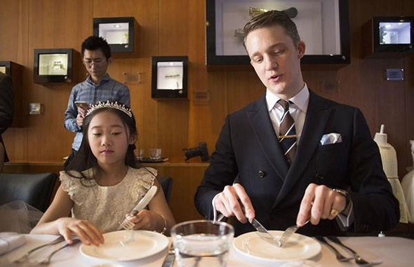 Shanghai,11/04/2016(El Pueblo en Línea)-Una ni?a aprende etiqueta de la aristocracia británica en un exclusivo club en Shanghai, en una foto sin fecha. El curso de etiqueta británica y costumbres y modales tradicionales británicos, a cargo del renombrado expertoen etiqueta británica James Seatton, comenzó recientemente en un exclusivo club con sede en Shanghai. Sus principales clientes son ni?os peque?os de familias ricas. Los cursos cuestan hasta 3800 yuanes (590 yuanes) al día. [Foto/Agencias]