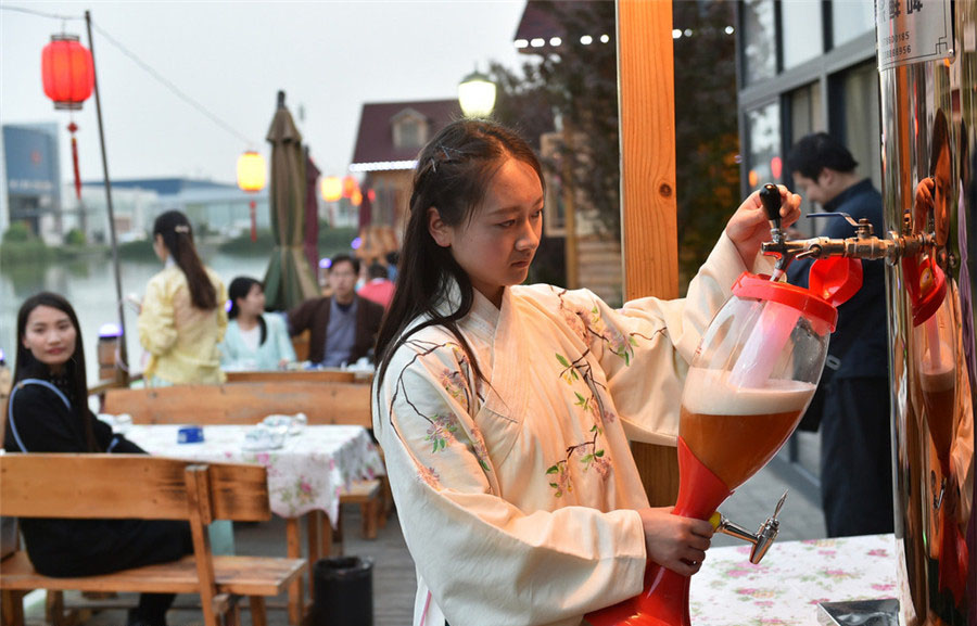 Una trabajadora prepara cerveza vestida con traje tradicional chino en un restaurante en la ciudad de Luoyang, provincia de Henan, el 9 de abril. Todos los empleados van vestidos con trajes tradicionales chinos. Su propietario espera promover la cultura tradicional china y ofrecer algo único en su establecimiento.