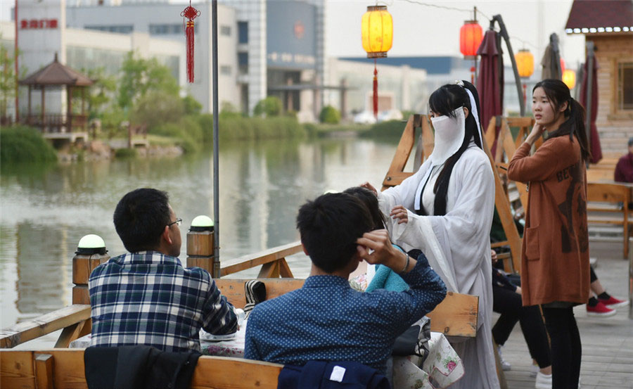 Una trabajadora sirve a los clientes vestida con traje tradicional chino en un restaurante en la ciudad de Luoyang, provincia de Henan, el 9 de abril. Todos los empleados van vestidos con trajes tradicionales chinos. Su propietario espera promover la cultura tradicional china y ofrecer algo único en su establecimiento.