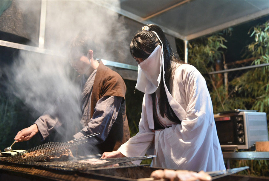 Luoyang,12/04/2016(El Pueblo en Línea)-Dos trabajadores cocinan platos a la barbacoa vestidos con trajes tradicionales chinos en un restaurante en la ciudad de Luoyang, provincia de Henan, el 9 de abril. Todos los empleados van vestidos con trajes tradicionales chinos. Su propietario espera promover la cultura tradicional china y ofrecer algo único en su establecimiento.