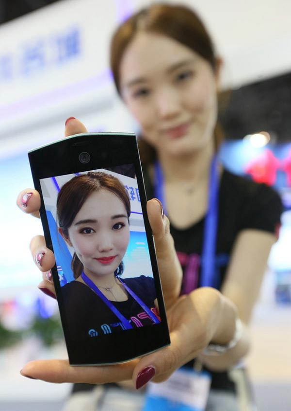 Una azafata utiliza la aplicación Meitu para retocar una foto en su teléfono durante una expo de software en Beijing, el 27 de mayo de 2015.