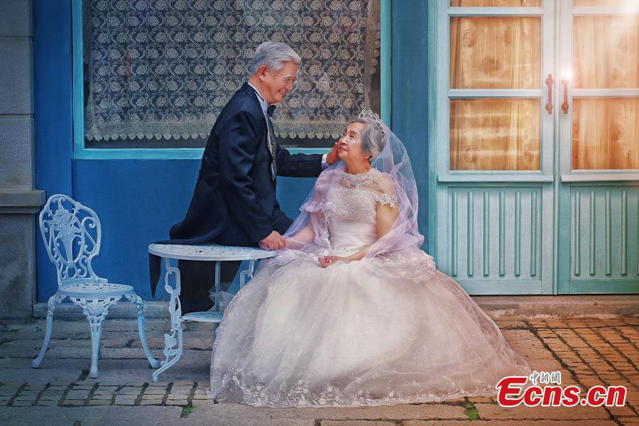 Zhang Yongsheng y su esposa Gu Fangyi, de más de ochenta a?os ambos, posan en la celebración de su 60 o aniversario de boda en la ciudad de Guangzhou, capital de la provincia de Guangdong. [Foto/China News Service]