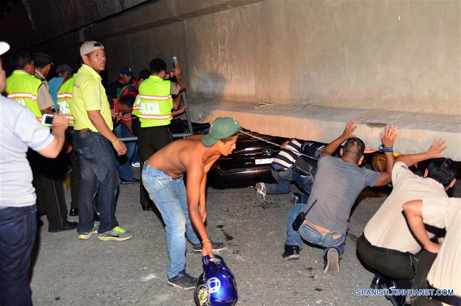 Personas intentan rescatar a víctimas luego de que colapsara un puente sobre vehículos tras un sismo, en la ciudad de Guayaquil, Ecuador, el 16 de abril de 2016. Sube a 41 la cifra de muertos por el terremoto de 7,8 grados de magnitud que sacudió el sábado a Ecuador, según el último balance oficial divulgado por el vicepresidente del país, Jorge Glas. El segundo mandatario dijo en una cadena nacional de televisión que se prevé que la cifra de fallecidos "va desgraciadamente a aumentar" en las proximas horas. "Hay un nivel de afectación importante", indicó Glas, quien a?adió que según un nuevo recálculo el terremoto tuvo una intensidad de 7,8 grados. (Xinhua/Ronald Cede?o/EL UNIVERSO)
