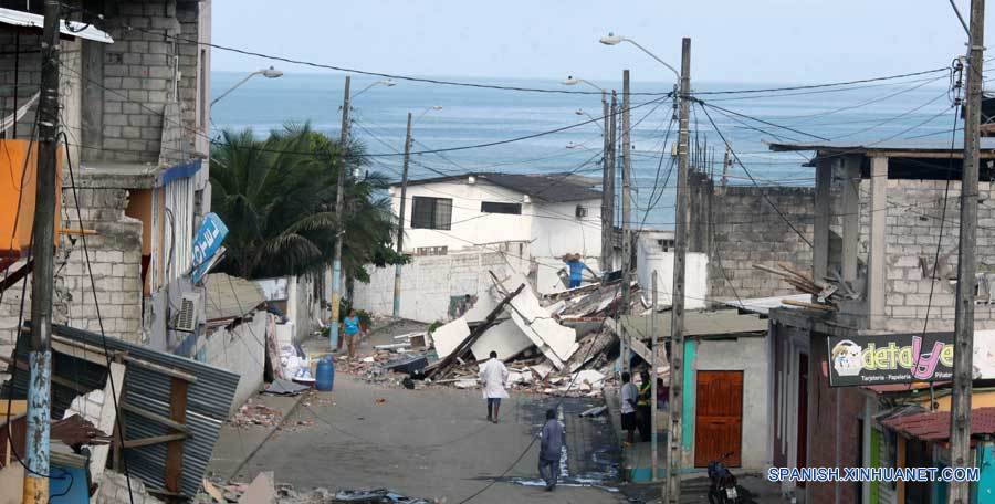 Imagen cedida por la Agencia Pública de Noticias del Ecuador y Suramérica ANDES, de empleados trabajando entre escombros luego del sismo, en Pedernales, en la provincia de Manabí, Ecuador, el 18 de abril de 2016. La Fiscalía General de Ecuador dio a conocer el lunes la lista de 376 personas muertas durante el sismo de 7,8 grados en la escala de Richter ocurrido la noche del sábado y que dejó también más de 2,000 heridos.(Xinhua/Micaela Ayala V./ANDES)