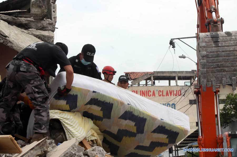Imagen cedida por la Agencia Pública de Noticias del Ecuador y Suramérica ANDES, de empleados trabajando entre escombros luego del sismo, en Pedernales, en la provincia de Manabí, Ecuador, el 18 de abril de 2016. La Fiscalía General de Ecuador dio a conocer el lunes la lista de 376 personas muertas durante el sismo de 7,8 grados en la escala de Richter ocurrido la noche del sábado y que dejó también más de 2,000 heridos.(Xinhua/Micaela Ayala V./ANDES)