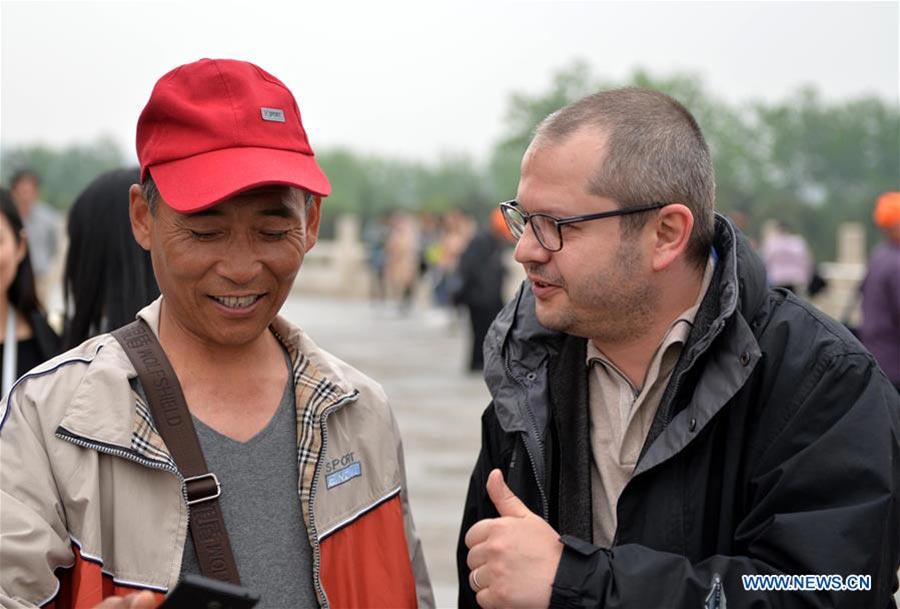 El director rumano Corneliu Porumboiu, un miembro del jurado del VI Festival Internacional de Cine de Beijing, habla con un turista en el Templo del Cielo en Beijing, el 19 de abril [Foto / Xinhua]