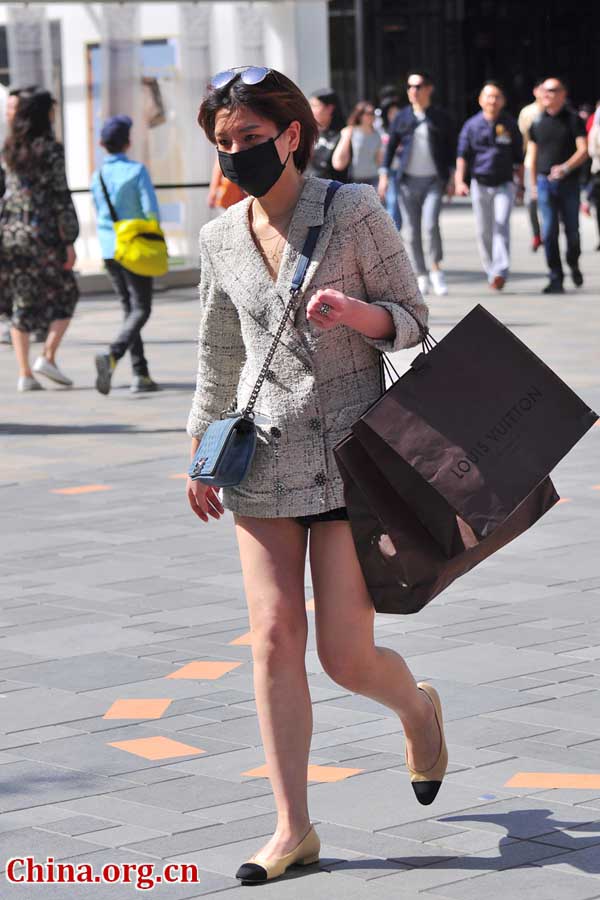 Una mujer con mini falda camina por las calles de Sanlitun en el distrito Chaoyang de Beijing, el 8 de abril de 2016.Los hombres y mujeres jóvenes de moda están impacientes por lucir sus estilos de verano a principios de primavera. [Foto por Guo Yiming / China.org.cn]