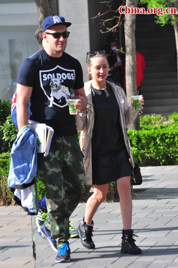Una mujer camina por las calles de Sanlitun en el distrito Chaoyang de Beijing, el 8 de abril de 2016.Los hombres y mujeres jóvenes de moda están impacientes por lucir sus estilos de verano a principios de primavera. [Foto por Guo Yiming / China.org.cn]