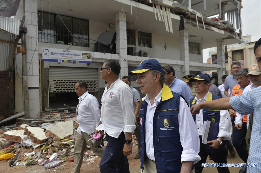 QUITO, 24 abr (Xinhua) -- El presidente de Colombia, Juan Manuel Santos, llegó hoy a la ciudad ecuatoriana de Manta en la provincia de Manabí (oeste) para entregar ayuda humanitaria a los damnificados del terremoto que afectó la zona costera de Ecuador el pasado 16 de abril.
