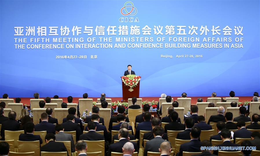BEIJING, 28 abr (Xinhua) -- El presidente chino, Xi Jinping, habla en la ceremonia de inauguración de la quinta reunión de cancilleres de la Conferencia sobre Interacción y Medidas de Construcción de Confianza en Asia (CICA, por sus siglas en inglés), celebrada en Beijing. (Xinhua/Ding Haitao)