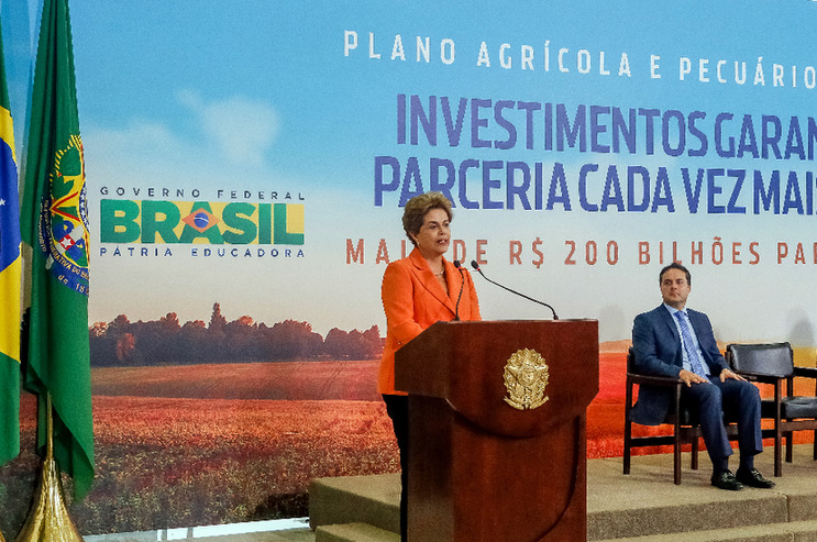 BRASILIA, mayo 4, 2016 (Xinhua) -- Imagen cedida por la Presidencia de Brasil de la presidenta brasile?a, Dilma Rousseff, pronunciando un discurso durante la ceremonia de lanzamiento del Plan Agrícola y Pecuario 2016-2017, en el Palacio de Planalto en Brasilia, Brasil, el 4 de mayo de 2016. La presidenta de Brasil, Dilma Rousseff, anunció el miércoles un crédito de 202.880 millones de reales (unos 57.965 millones de dólares estadounidenses) para el Plan Agrícola y Pecuario 2016-2017. (Xinhua/Roberto Stuckert Filho/Presidencia de Brasil)