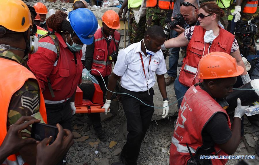Una mujer fue encontrada hoy con vida bajo los escombros de un edificio residencial derrumbado hace seis días en Nairobi, la capital de Kenia.(Xinhua/Li Baishun)