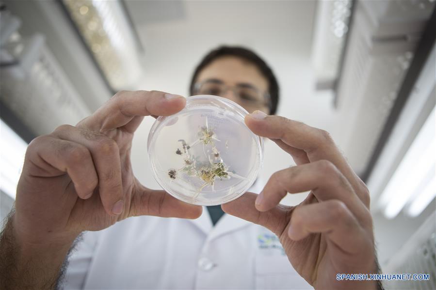 Un técnico observa brotes de alfalfa inoculados con una bacteria para generar un evento transgénico en un "cuarto de crecimiento" del área de transformación y cultivo de tejidos vegetales de la empresa argentina Bioceres, en la ciudad de Rosario, provincia de Santa Fe, a 300km de Buenos Aires, Argentina. (Xinhua/Martín Zabala)